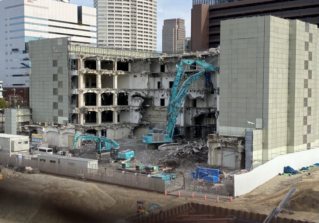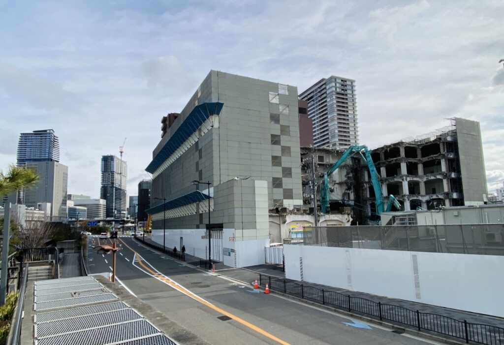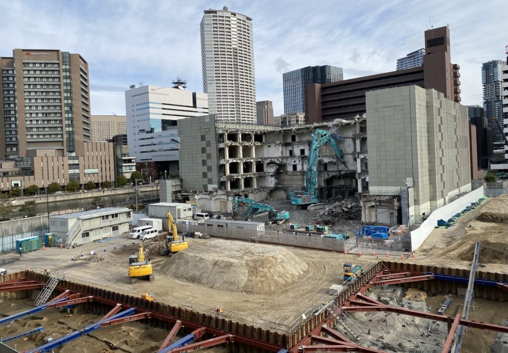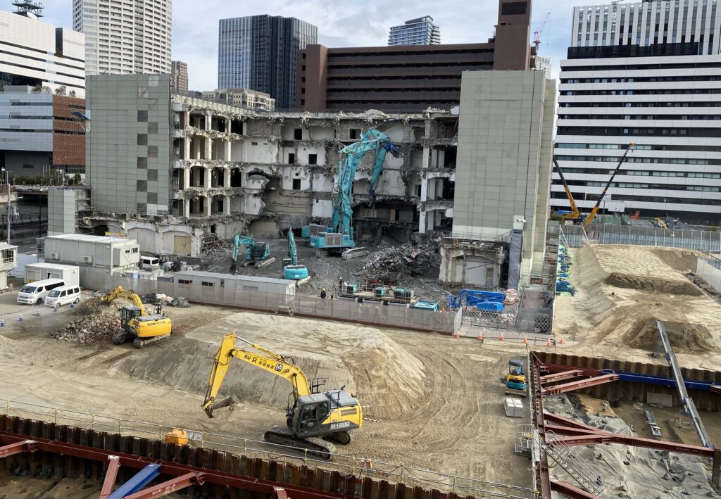 2023年春に閉鎖された大阪市北区中之島5丁目にあるNTTコミュニケーションズ中之島ビルが、建物解体工事の真っ最中です。本件はすでにタワーマンション2棟の計画が明らかとなった中之島五丁目地区ですので、今後どのような計画となるのか大変楽しみです。