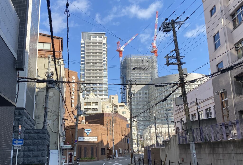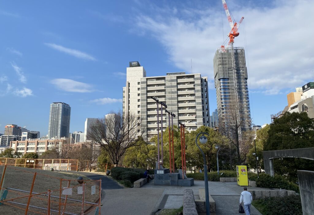 最後は最近敷地内でリニューアル工事が盛んに行われている扇町公園からの様子です。手前に建つ北野病院が干渉してくるかなと思っていましたが、予想に反してもうすっかり頭二つくらい飛び出していました。まだ高さは増してまいりますので、最終的に育ちきって頭三つほど抜けた存在感マックスの姿が今から楽しみです。