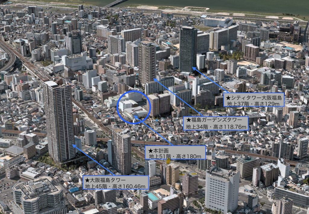 (仮称)大阪市福島区鷺洲1丁目分譲計画は大阪市福島区鷺洲の阪神百貨店野田配送センター跡と隣接する関西スーパー福島店跡などに計画されている地上51階のタワーマンション計画です。