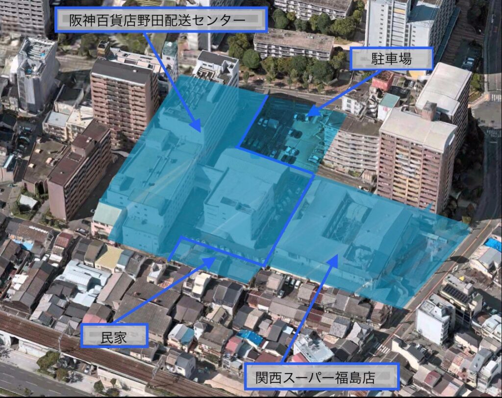 一部民民家のあった敷地もありますが、大半がもと阪神百貨店野田配送センターと隣接するもと関西スーパー福島店の敷地となります。