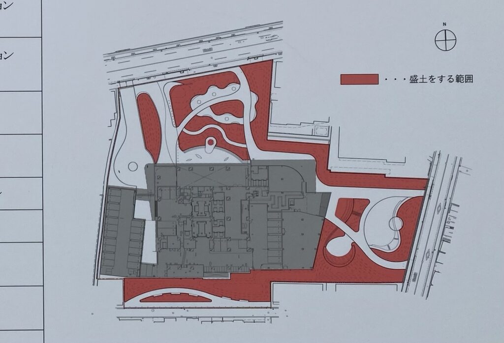 宅地造成又は特定盛土等に関する工事の許可済標識による盛土の範囲です。敷地そのものが1ha近くある広大なものですが、これだけの盛土に散策路や植栽となると居住者以外の人も憩いの場として利用しそうですね。
