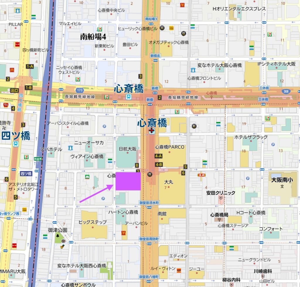 大阪メトロ御堂筋「心斎橋駅」の真上に位置し、地下からの7番出口は敷地内にありますので、交通アクセスには大変恵まれた立地です。