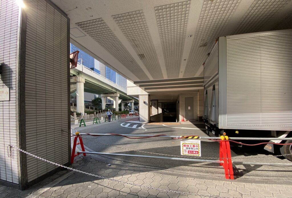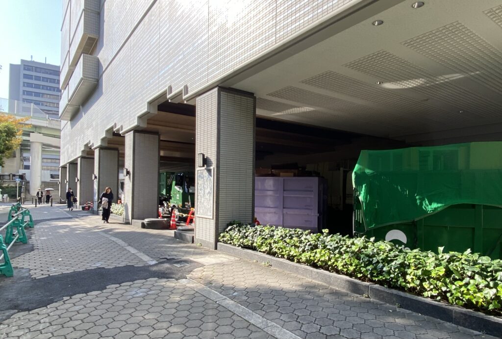 現在エントランス付近は立ち入り禁止となっており、館内の廃棄物を収集するコンテナが用意されていました。もうすでに搬出が進んでいます。